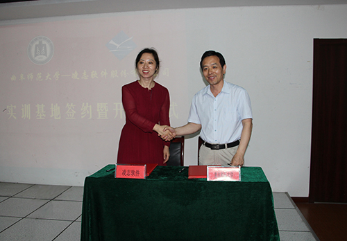 凌志軟件龐軍副總裁與曲阜師范大學信息工程學院領導簽訂了實訓基地合作協議,并為“曲阜示范大學教學實訓基地”揭牌。