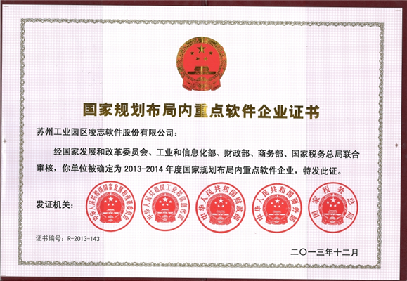 凌志軟件是2013-2014年蘇州唯一一家獲得此資質的軟件企業,再次獲得此項榮譽,說明了國家對公司實力的再次肯定,進一步確定凌志軟件在軟件行業中的領先地位。