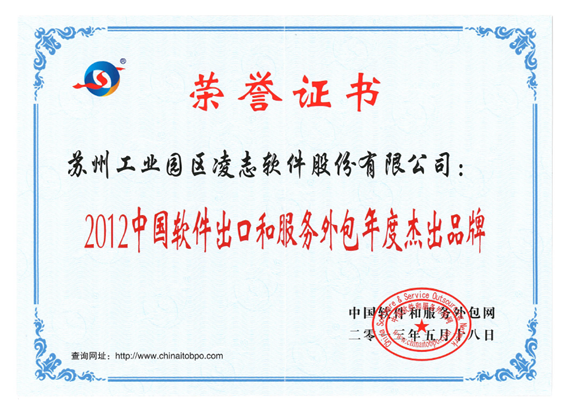 2013年5月,第九屆中國軟件出口(服務外包)排行榜發布會在寧海召開。十年的發展,凌志軟件在軟件外包上取得了喜人的成績,此次榮獲“2012年中國軟件出口和服務外包杰出品牌”和“2012中國軟件出口企業排名第8名”的稱號。