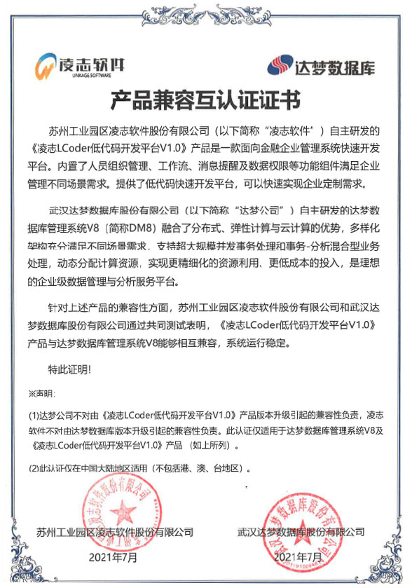 凌志軟件又一產(chǎn)品——凌志LCoder低代碼開發(fā)平臺軟件V1.0完成了與銀河麒麟高級服務(wù)器操作系統(tǒng)V10(兆芯版、海光版、AMD64版)兼容性互認(rèn)證測試,達(dá)到通用兼容性要求及性能、可靠性要求,滿足用戶實(shí)現(xiàn)應(yīng)用的關(guān)鍵性需求,并與達(dá)夢數(shù)據(jù)庫管理系統(tǒng)V8通過互認(rèn)證。