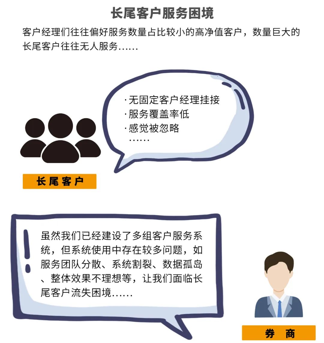 金融科技的應用發展,推動證券行業獲客渠道向線上轉變,客戶增加呈跨越式增長。與此同時,數量巨大的客戶與券商有限的服務資源產生的矛盾愈演愈烈,導致大量的長尾客戶(中小客戶)缺乏優質服務。
