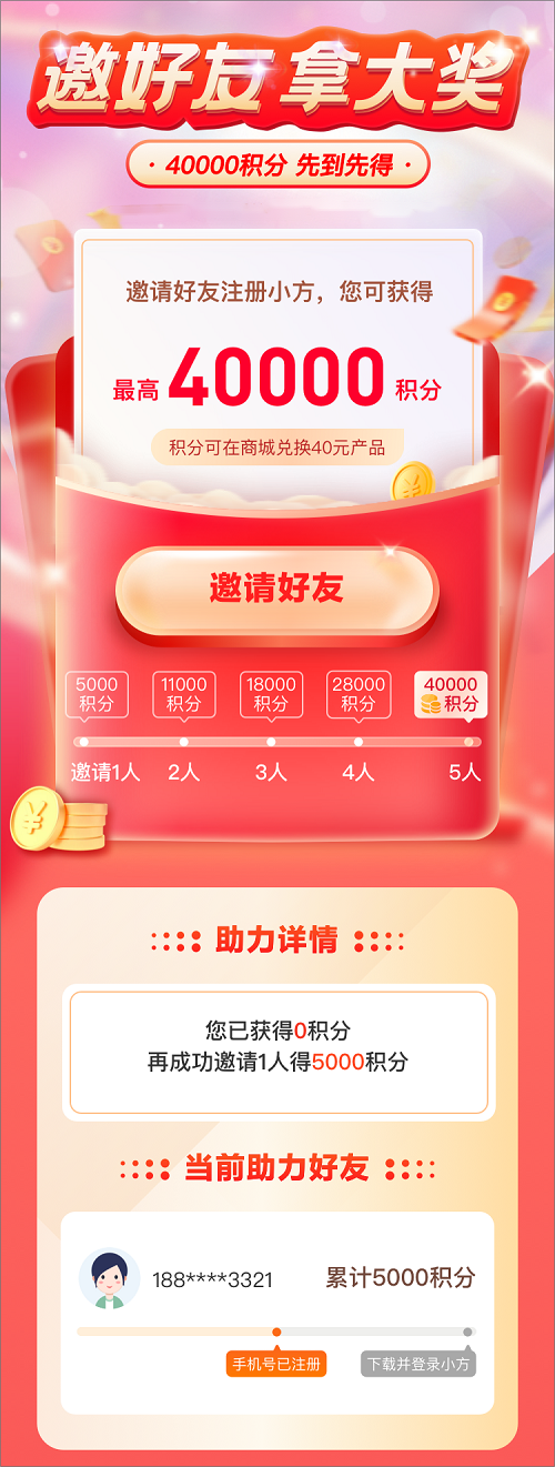以邀請好友注冊的形式實現裂變活動,通過做任務的方式讓邀請人及被邀請人均獲得積分獎勵從而達到更多用戶注冊的目標。