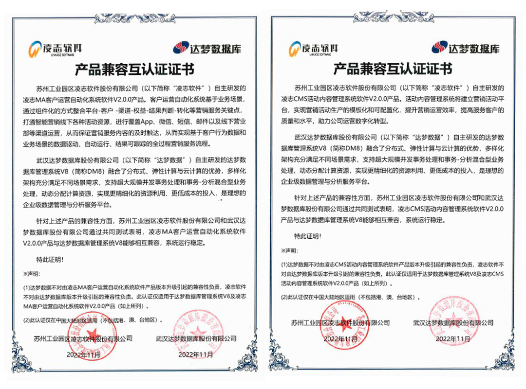 同期,凌志軟件上述兩款產品與達夢數據庫管理系統V8完成產品兼容互認證,認證結果表明雙方產品能夠相互兼容、系統運行穩定。