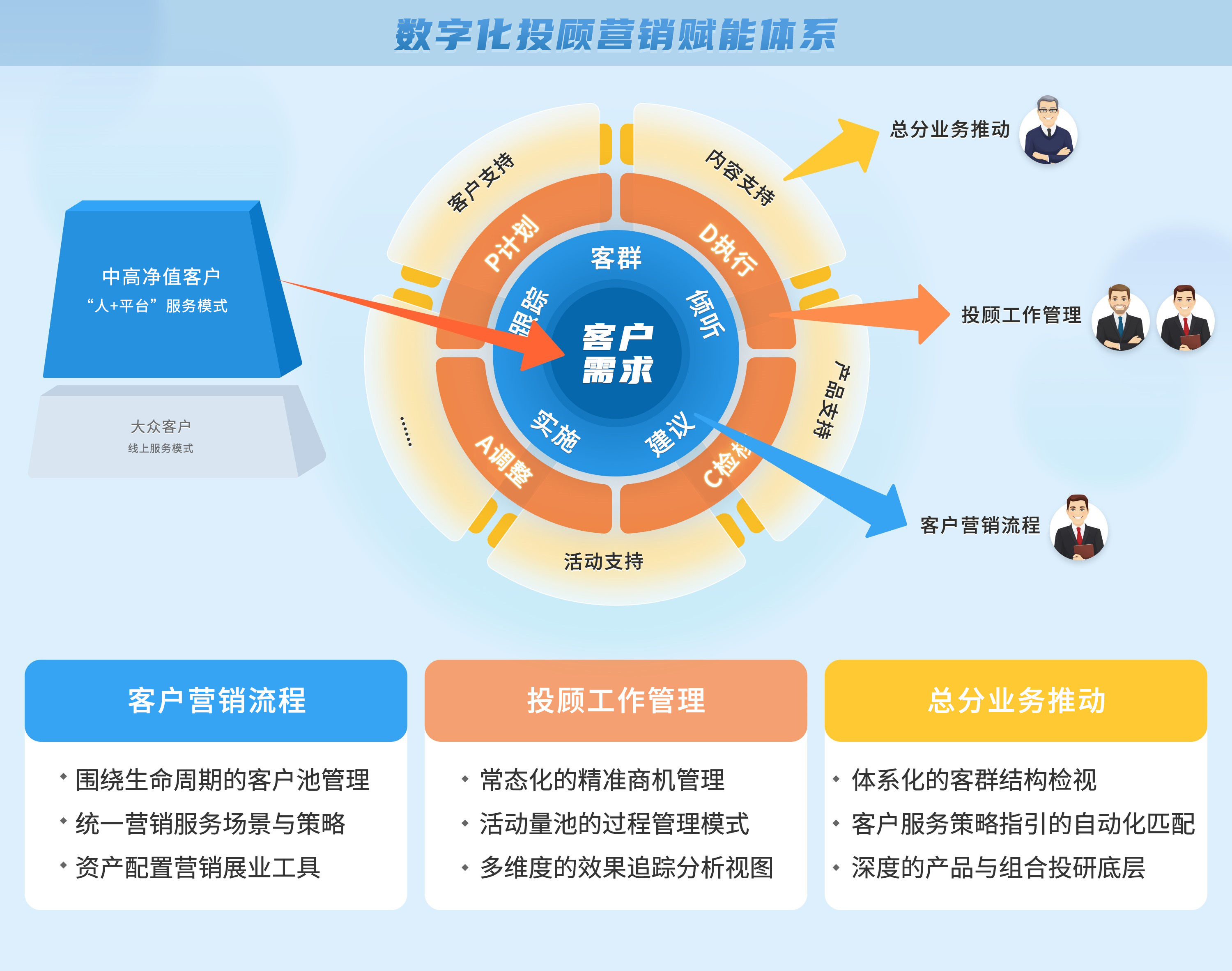 數字化投顧營銷賦能體系的實際落地,依托兩大核心能力,一是以資產配置服務為中心的買方投顧業務能力,二是關注客戶AUM結構的客群經營能力。旨在解決券商現有投顧展業平臺存在的問題,包括總分中臺與一線團隊業績達成思路不一致、一線管盤客戶服務覆蓋不足、日常服務無法滿足客戶個性化需求、以及投顧工作過程管理不透明等現狀。