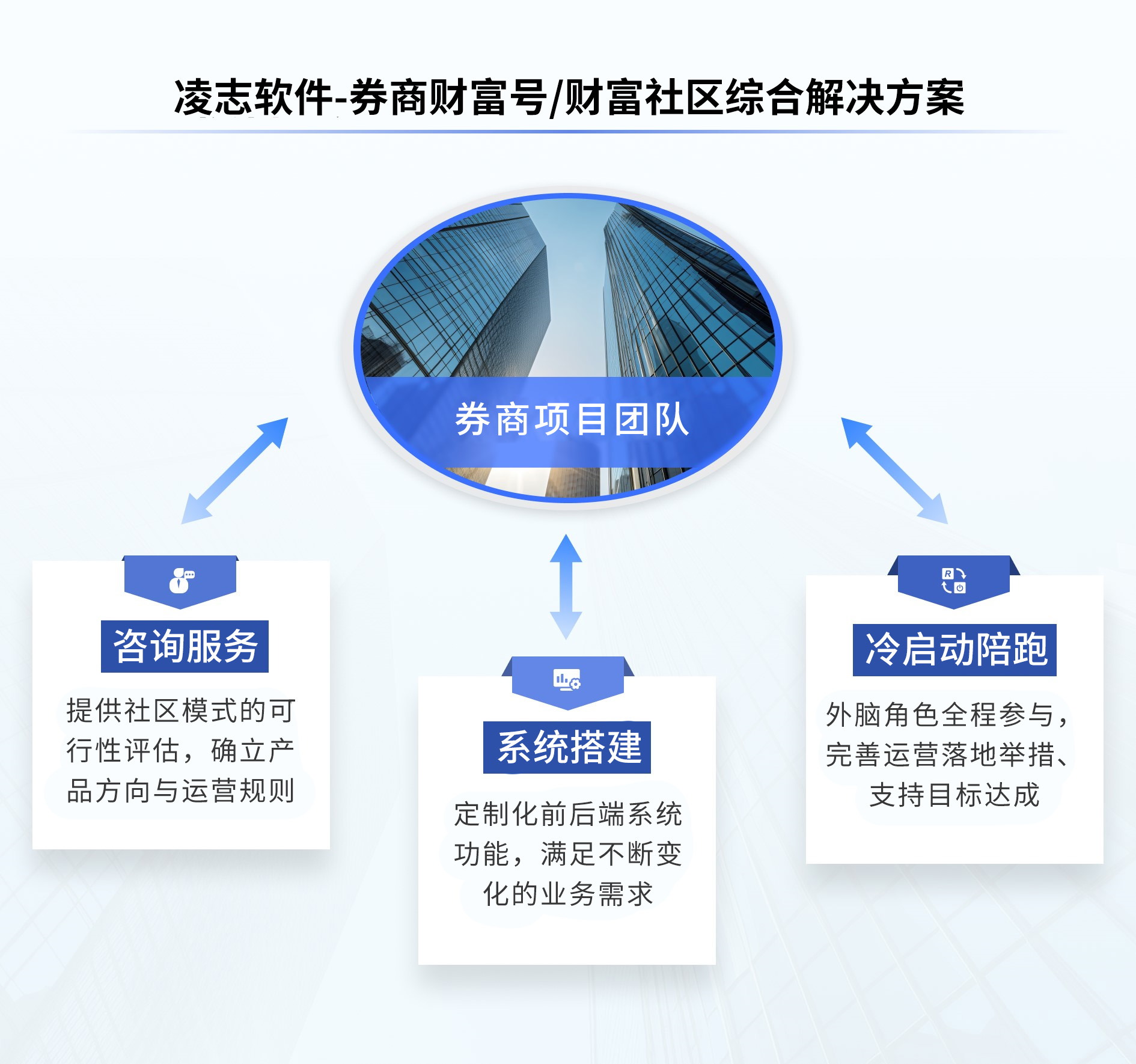 結(jié)合行業(yè)發(fā)展需求,凌志軟件基于對(duì)券商內(nèi)在條件、資源配置和獨(dú)特需求的深度分析,全面評(píng)估最適合的模式及可行性,為券商提供券商財(cái)富號(hào)/財(cái)富社區(qū)綜合解決方案,方案圍繞社區(qū)創(chuàng)建,從運(yùn)營(yíng)規(guī)劃、系統(tǒng)實(shí)施、上線啟動(dòng)到常態(tài)化過(guò)程,為券商順利啟動(dòng)和優(yōu)化社區(qū)服務(wù)保駕護(hù)航。